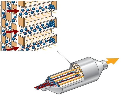 Spaliny, wydobywając się na zewnątrz, muszą przejść przez filtr cząstek stałych składający się z wielkiej ilości kanalików, z których każdy jest zaślepiony naprzemian z jednej strony. Spaliny, które się dostały do kanalików od strony otwartego końca, muszą przejść przez porowate ścianki boczne do sąsiednich kanalików otwartych od strony wylotu, przy czym w kanalikach otwartych od strony wlotu pozostają odfiltrowane cząstki stałe (cząstki sadzy), które nie mogą przeniknąć przez ścianki.